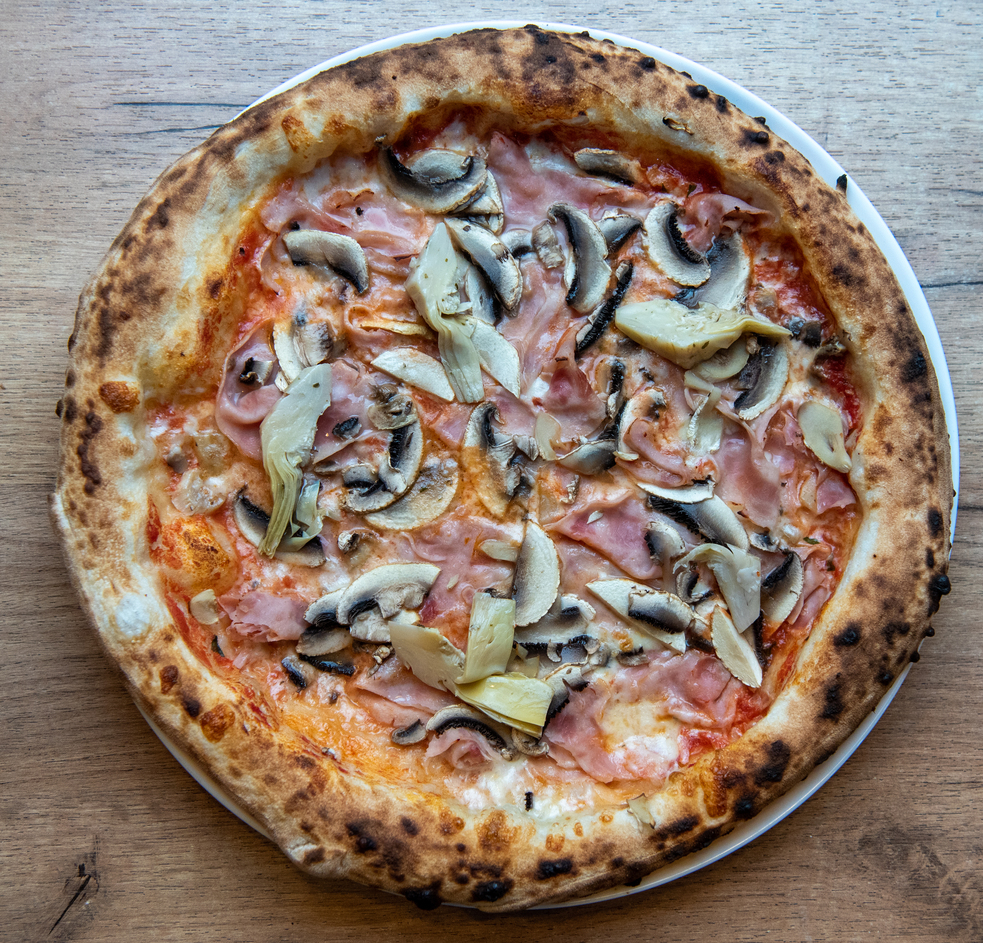 Sos de roșii, mozzarella, salam picant, prosciutto cotto, ciuperci, anghinare
